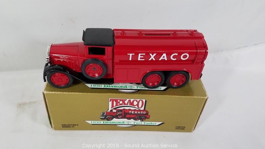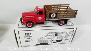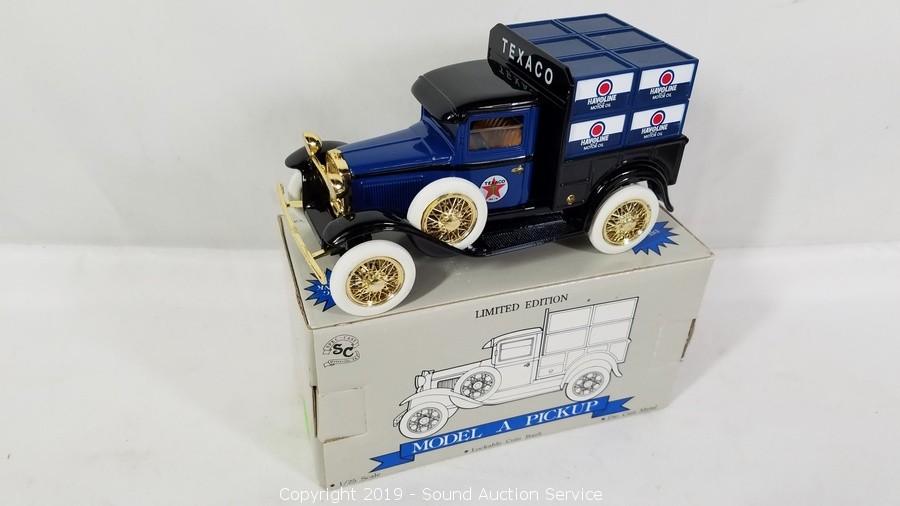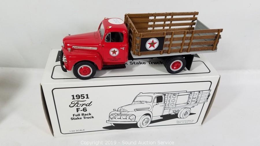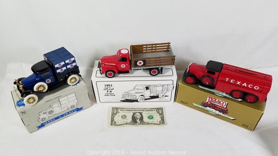 Item Description: 1951 Ford F-6 Truck 1:34, 1:25 Model A Pickup coin bank, and Ertl 1930 Texaco Diamond Fuel Tanker. All appear to be NIB.
