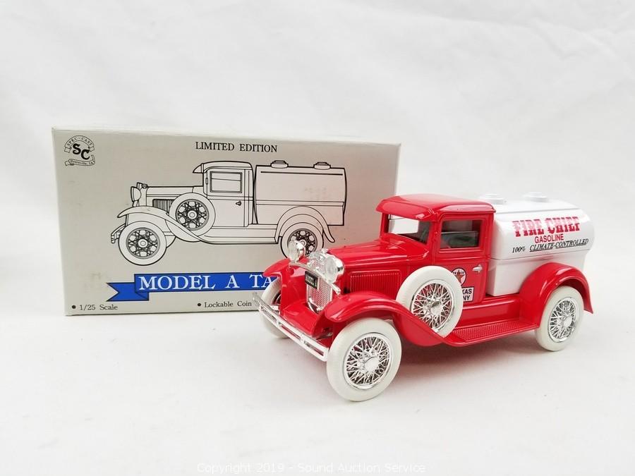 Item Description: 1949 Chevrolet Panel truck, Ford Model A Tanker, and 1940 Panel van. All appear to be NIP.