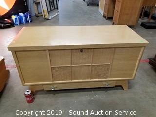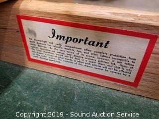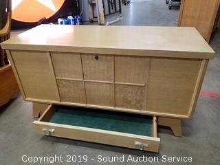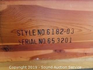 Item Description: Dated from serial 10/23/56. Serial 653201. Some wear to the finish in the top, overall good condition. Has a lower felt lined drawer. 22" H x 43" W x 17" D.