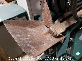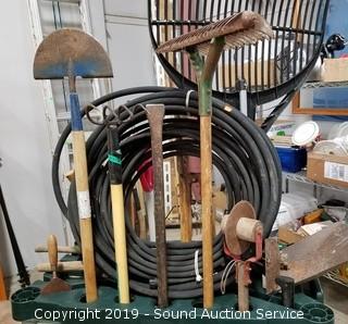Item Description: Includes house mount hose holders, rakes, hose, cultivator, post hole digger, edger, pry bar & more.