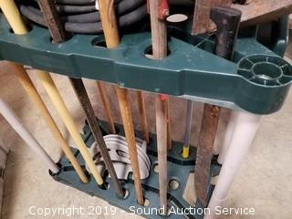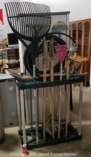 Lot #0030: Garden & Yard Tool Rack with Yard Tools