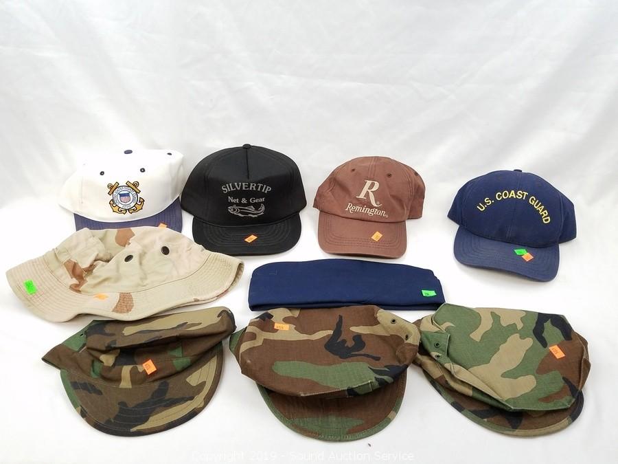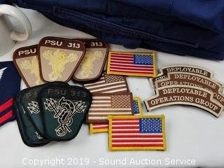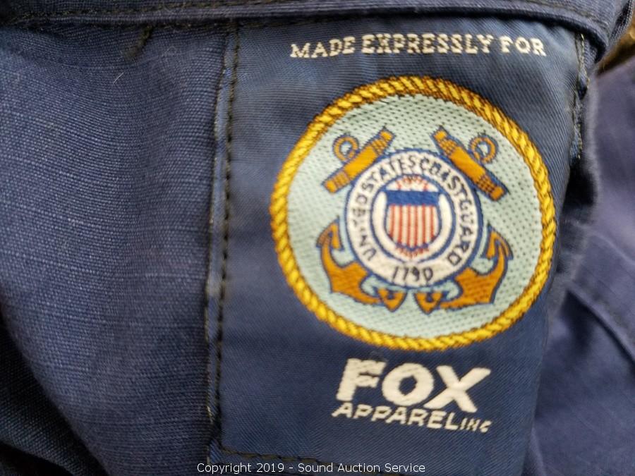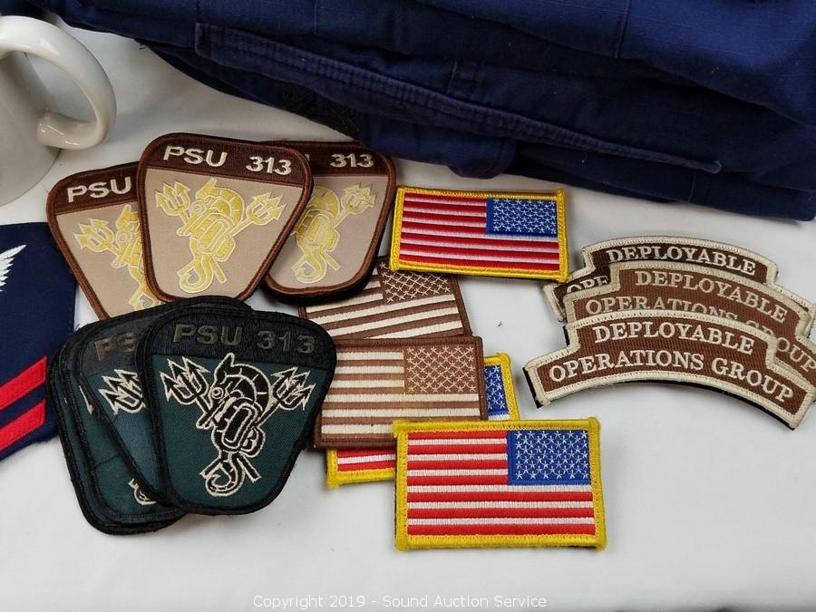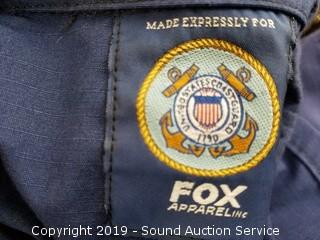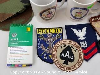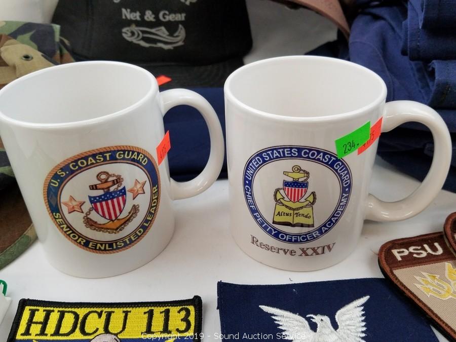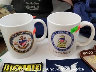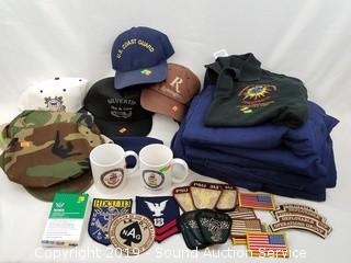 Item Description: USAF T-Shirt, 3 pairs of Coast Guard Large/Regular trousers, Coast Guard long sleeve coats 46 regular, Coast Guard and other military hats, various patches, and 2 Coast Guard mugs.