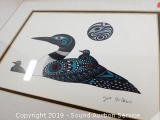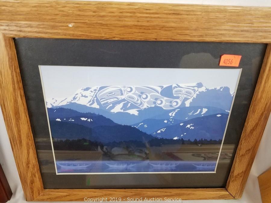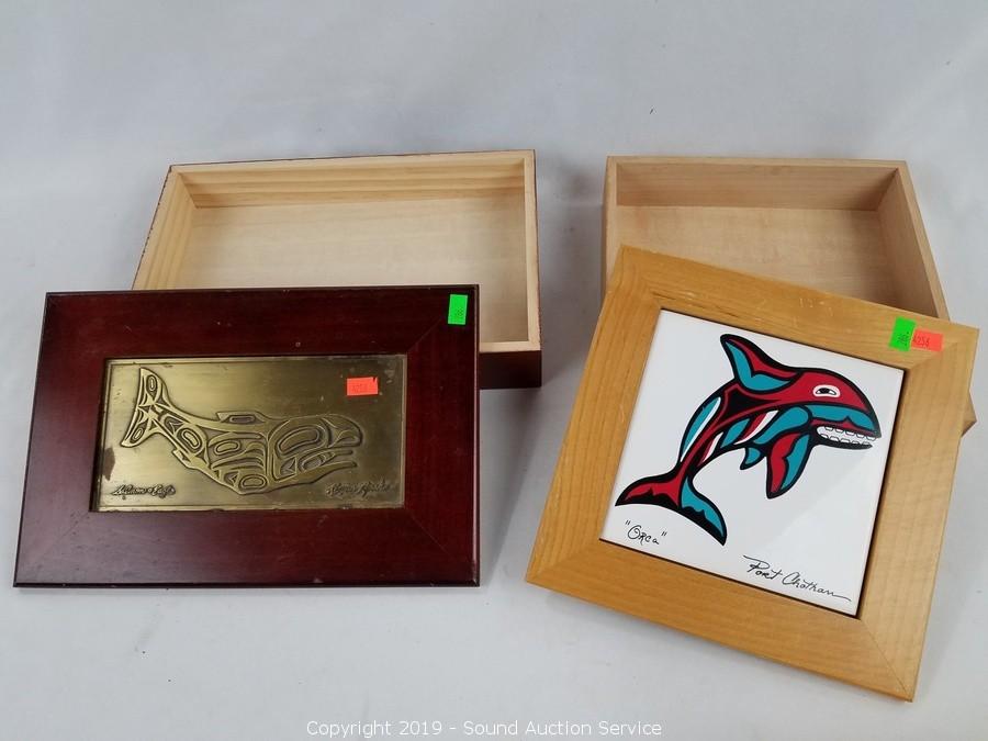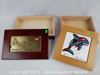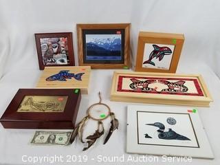 Item Description: Joe Wilson duck print, Native American mountain scene print, totem tile trivet, Roxana Leask salmon and eagle box, Joe Wilson salmon legend box, Port Chotham? orca wood and tile box, Clarence Wells? wooden box, and small dreamcatcher.