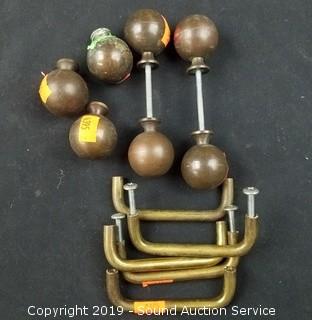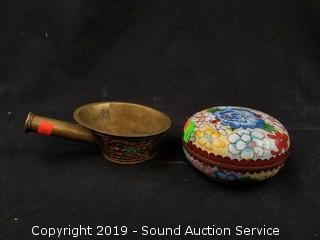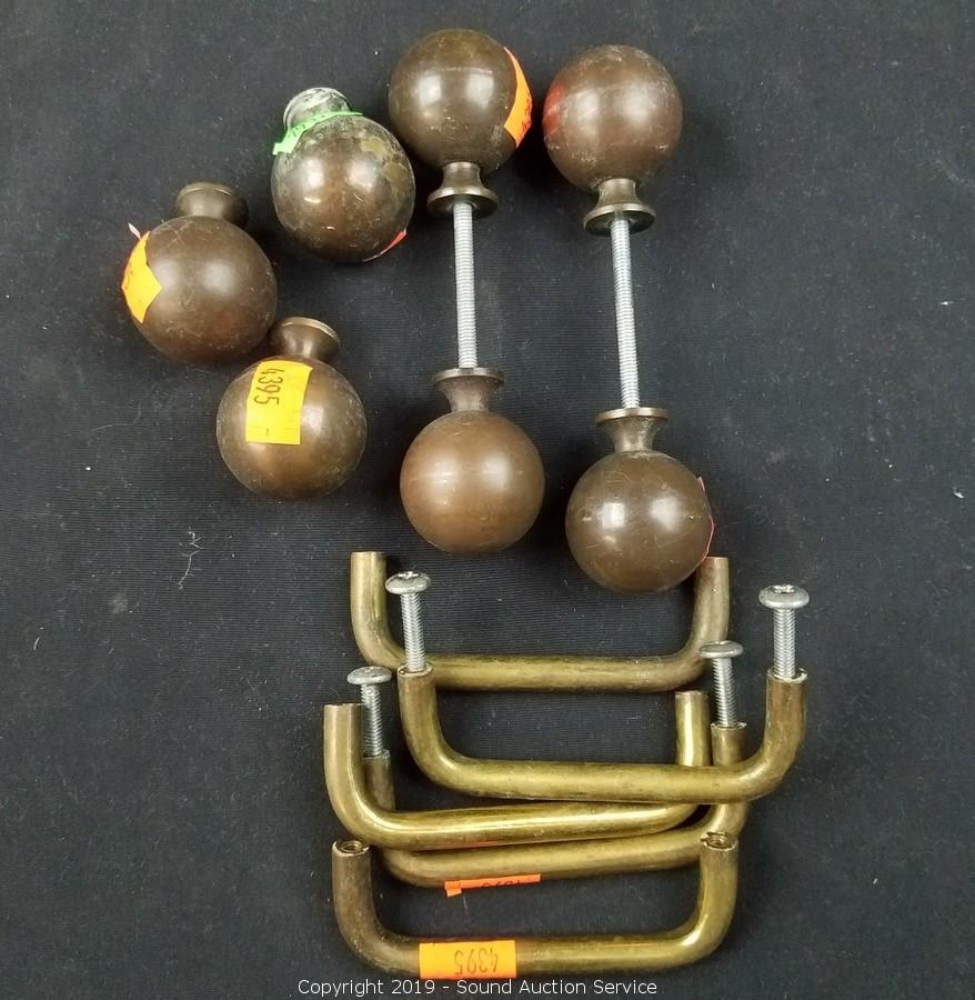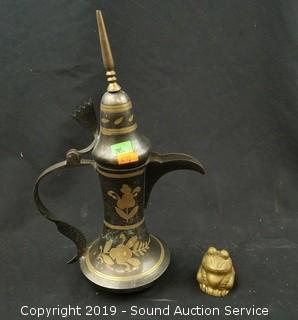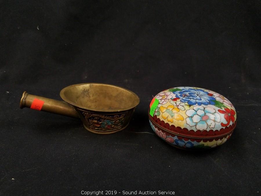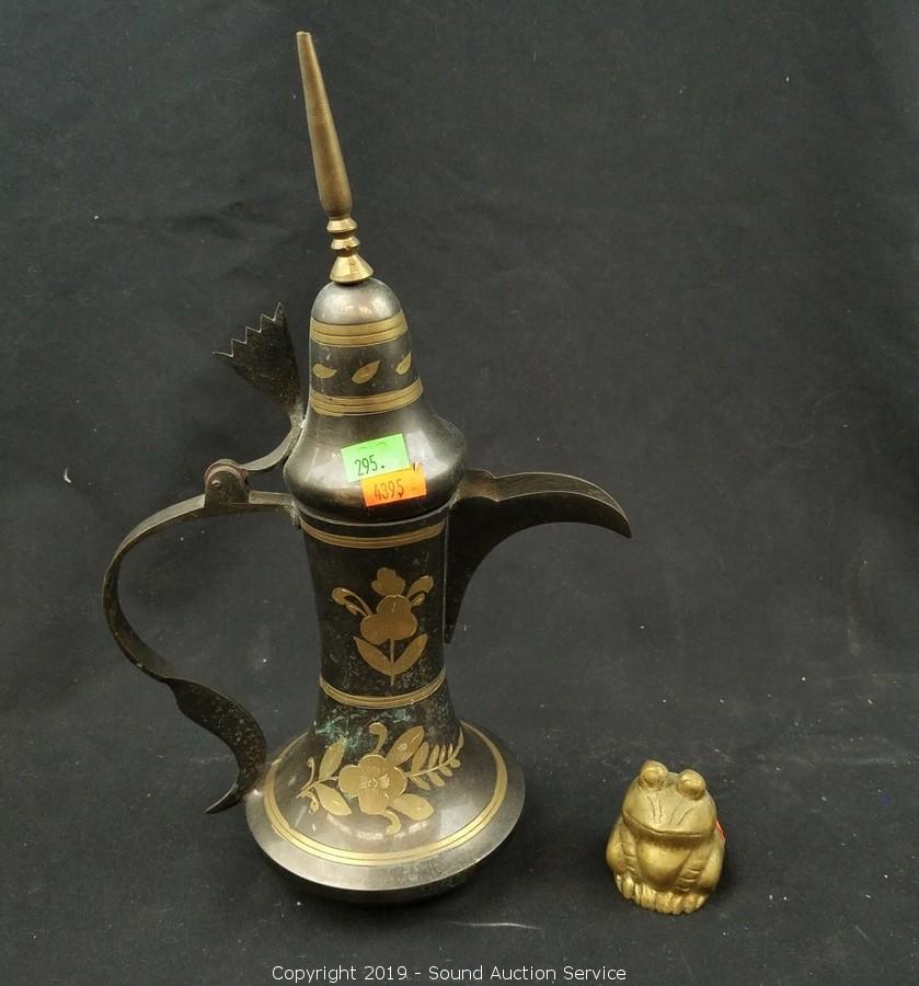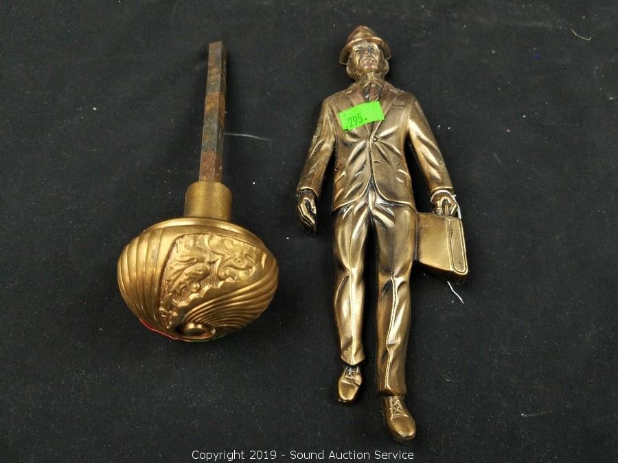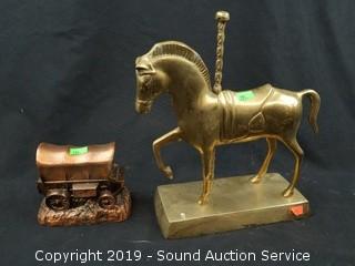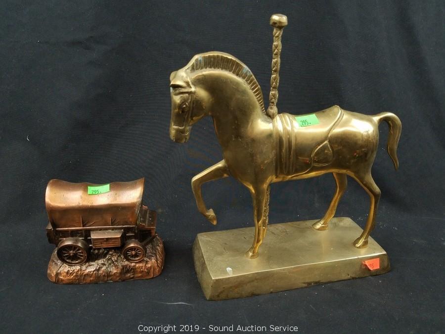 Item Description: Solid brass drawer pulls, cloisonn? covered dish, etched brass double sided shot glass, bud vase, carousel horse sculpture, copper coin bank, scoop/cup, frog and business man figures.