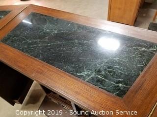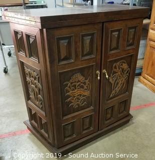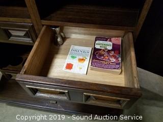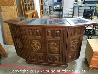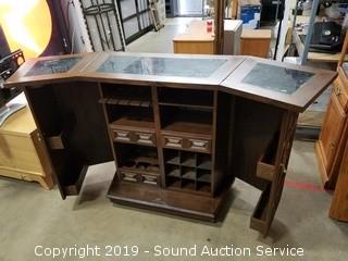 Item Description: Inlayed top, dovetail construction, on casters. Comes with "Bartenders Guide" book, "Mixing & Serving Drinks" books & shot measurer. Top folds up and sides fold in for storage, on casters. 40" H x 73" W x 19" Opened. 40" H x 38" W x 19" closed.