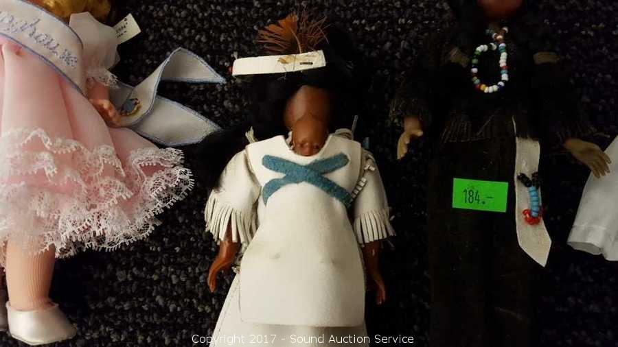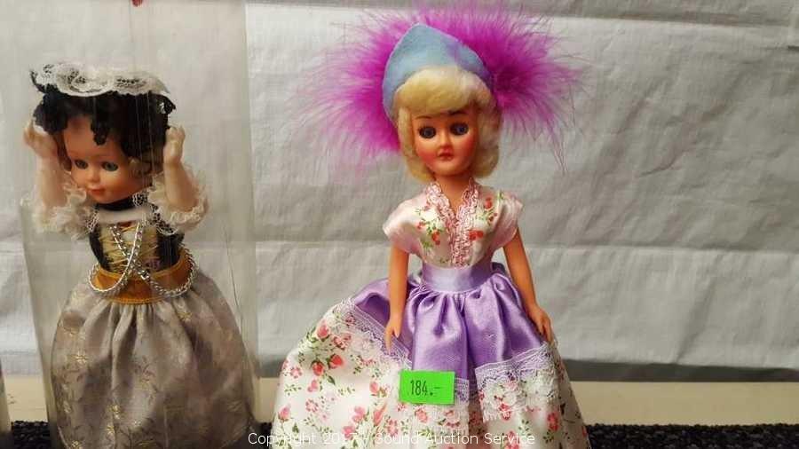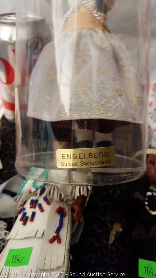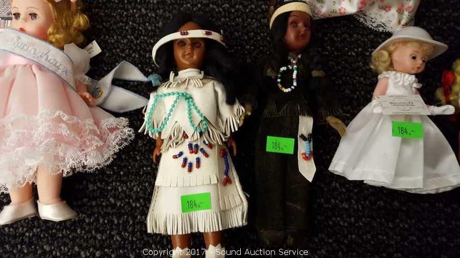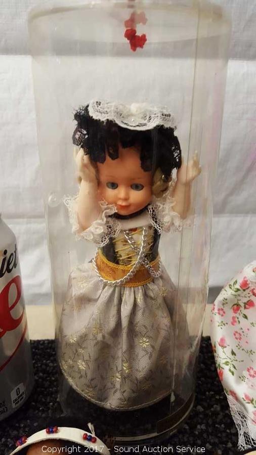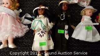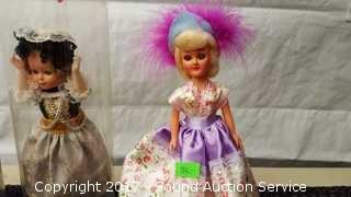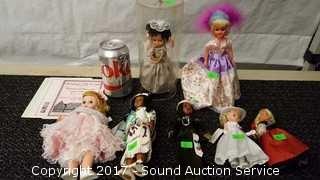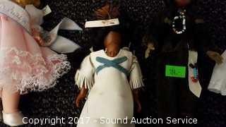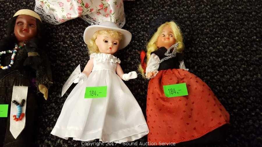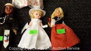 All vintage plastic. Two are Madame Alexander one is a Special Event Doll 1994 #11/300 one comes with COA. Also comes with Engleberg Suisse Switzerland Doll in Display. Approx. 5" to 9" tall.