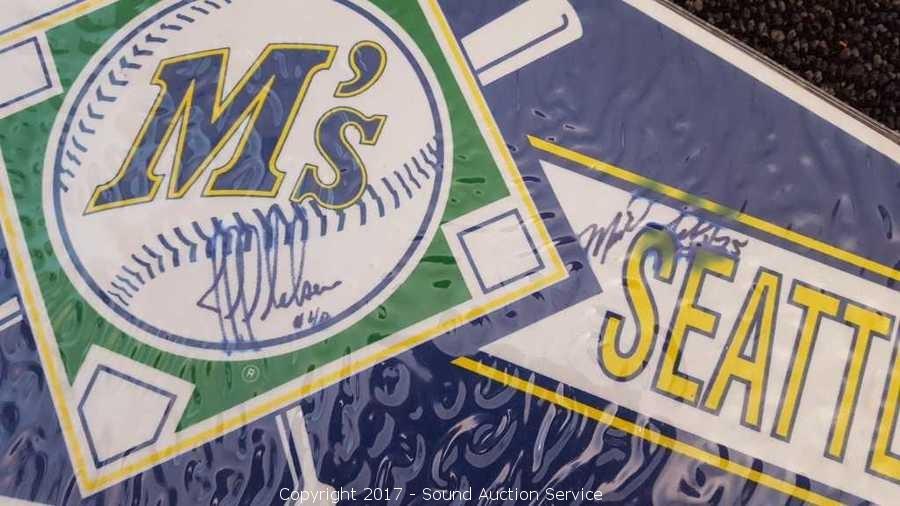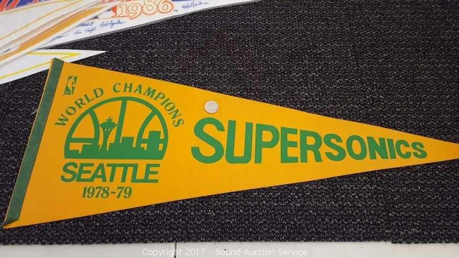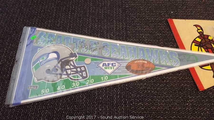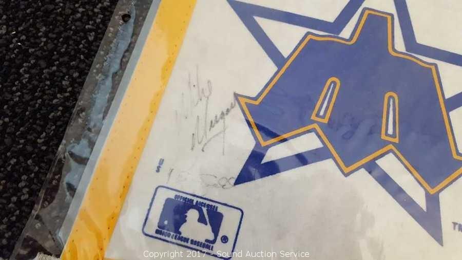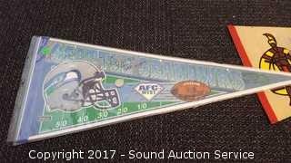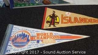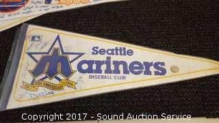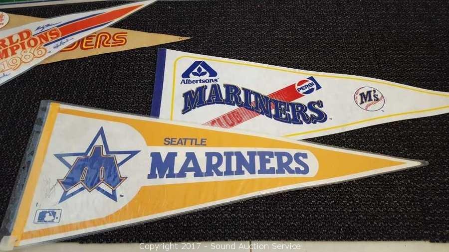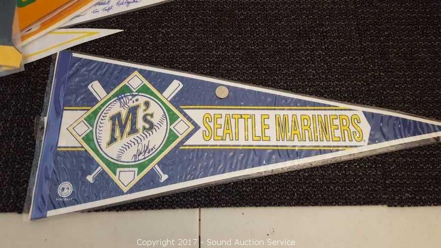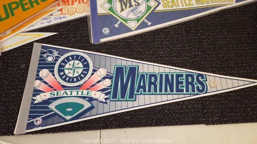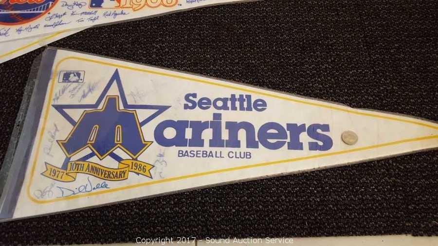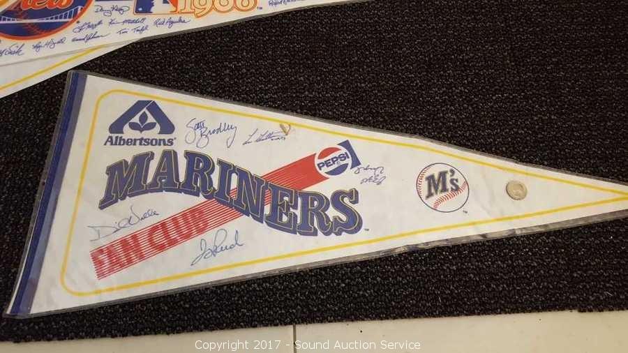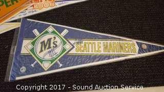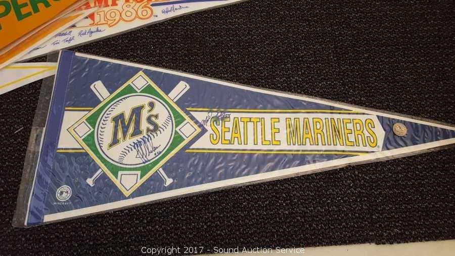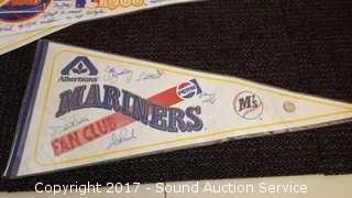 Includes: several signed Mariners pennants, METS World Champion signed pennant, Seattle Supersonics World Champion pennant, and Seattle Seahawks signed pennant.