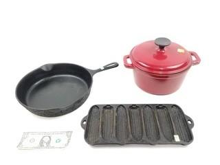 Item Description: 10.5" skillet, Bella cast iron enamelware dutch oven, and cornbread pan.