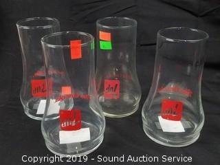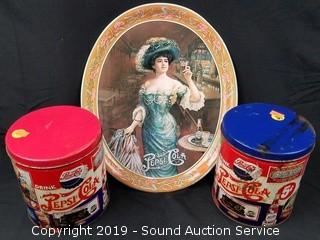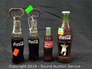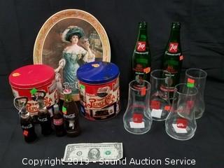 Item Description: 7-UP Uncola Glasses & Bottles, Coca-Cola Bottle Openers, Pepsi Cola Tins & Tray.