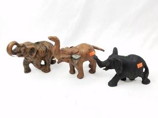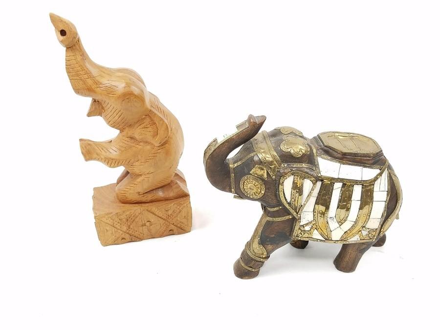 Item Description: 2 are candles, 1 is hand carved wood accented with brass & bone, one is wrapped in leather, silver one is missing its tusks. 5" to 11" tall.