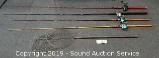 Lot #0166: 4 Fishing Rods w/Reels & Net