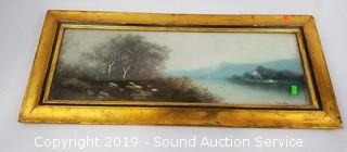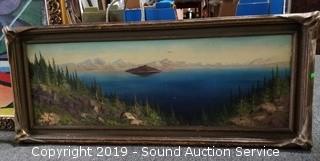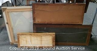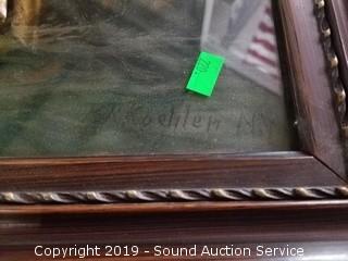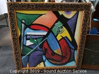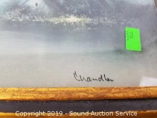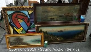 Item Description: One is by Chandler 12" x 28", one is PR Kohlen 35.5" x 15.5", ornate antique framed original on canvas board (has some damage, frame fits 13" x 38" artwork), and abstract print on canvas 30" diameter.