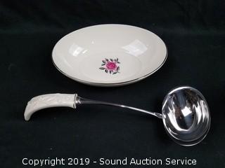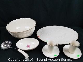 Item Description: Punch bowl with ladle, 2 mugs, 19" platter, 2 saucers, and 8.5" oval bowl.