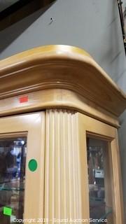Item Description: 73" H x 28" W x 14" D. Beveled Glass doors, glass adjustable shelves with plate grooves.
