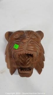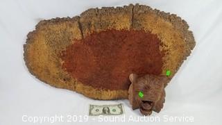 Lot #0390: Carved Teak? Tiger Mask & Burl Slab