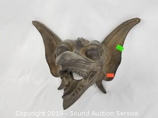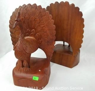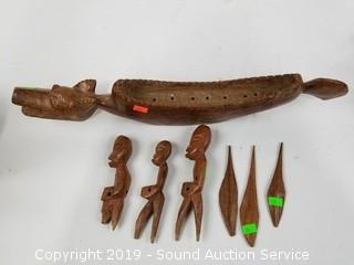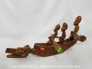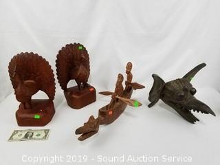 Lot #0296: Carved Wooden Canoe, Mask & Peacock Sculptures