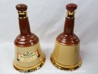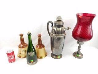 Item Description: Wine bottle oil lamp, hand cut ruby glass compote, 2 Wade Bellscotch Whiskey decanter's and 16" Apollo EPNS carafe.