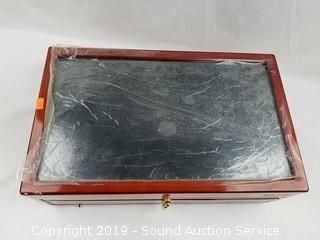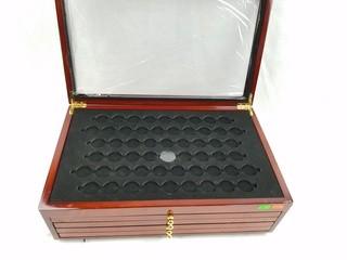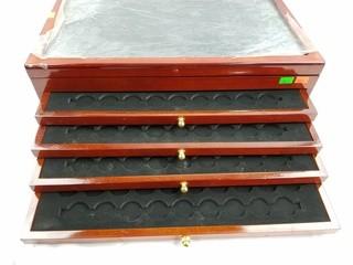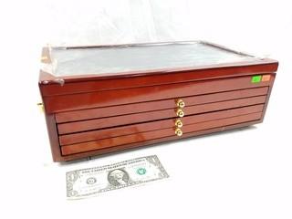 Item Description: 4 drawers and clear top display. Holds 330 quarters. Approx. 5.5" x 17" x 10". Still has some of the original protective plastic.