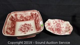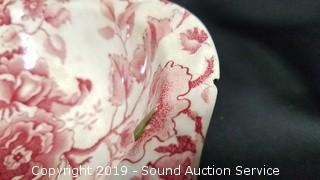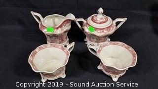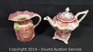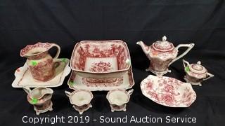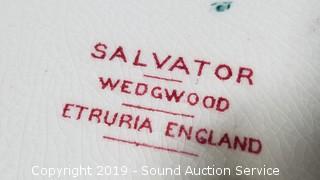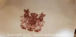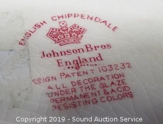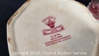 Item Description: Tea set has double lion rampant hallmark, cherub print(cream, sugar, teapot, large bowl, platter, and 2 teacups). Also includes a Wedgwood Salvator plate, Masons Vista England pitcher, and Johnson Brother English Chippendale.