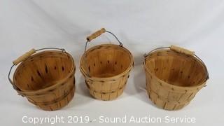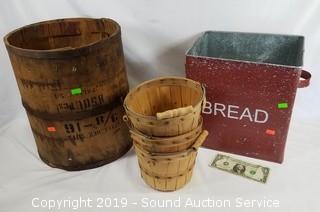 Lot #0122: Vtg. Nut Barrel, Fruit Baskets & Bread Tin.