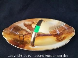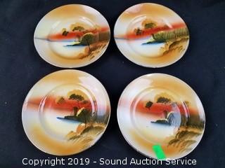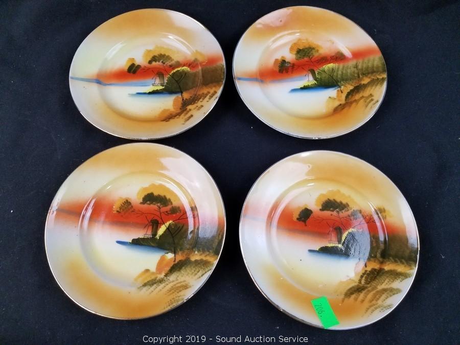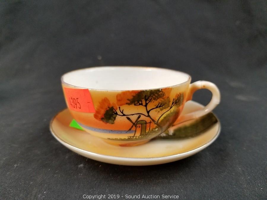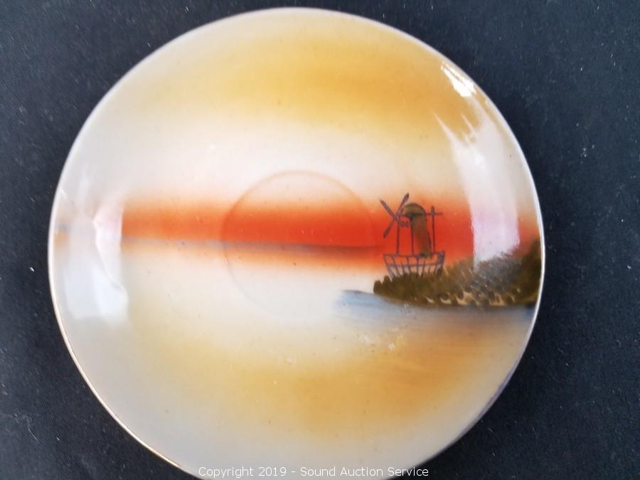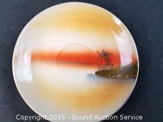 Item Description: Miniature teapot, cream, sugar, 4 cups, 4 saucers, and 4 snack plates. Also includes Nippon handled dish. Tea set is painted with images of a windmill.