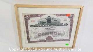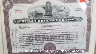 Item Description: Both are framed with glass. The stock certificate is $100 for "The Sperry Corporation Educational Fun. 14" x 17" & 11-1/2" x 14-1/2".