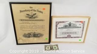 Lot #0213: 1922 Naval Service Cert. & 1954 Stock Cert.