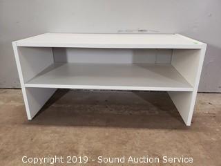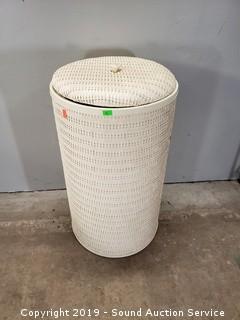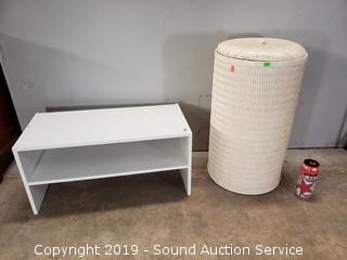 Lot #0051: 2-Tier White Shelf & Woven Laundry Hamper
