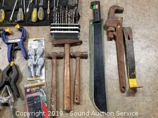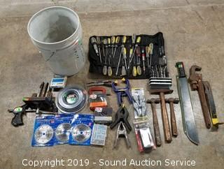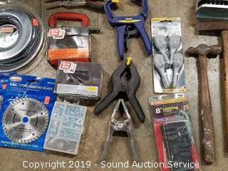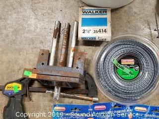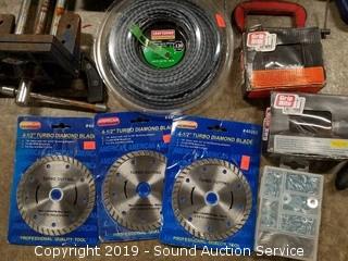 Item Description: Vise, clamps, machete, spiral shape .130 trimmer string, 4.5" diamond cutting blades, hammers, pipe wrench, washers, straps, and more.