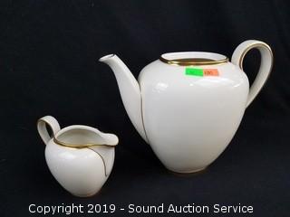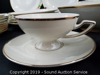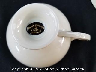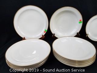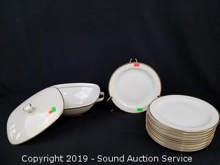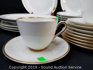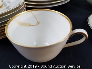Item Description: Ivory with gold trim. Includes 13 Saucers (4 are Lenox Mansfield, 4 are Johann Haviland Bavaria Germany), (11) 7" Salad Plates, (6) 9" Bowls, (6) 10" Dinner Plates, 9" Covered Server, Teapot (no lid), Creamer, 3 Lenox Mansfield Cups, 3 Krauthein Cups, 4 Johann Haviland Cups.