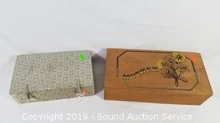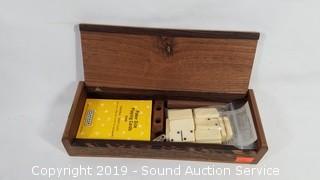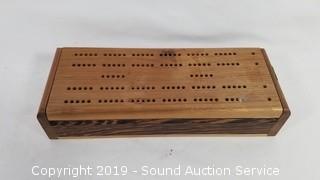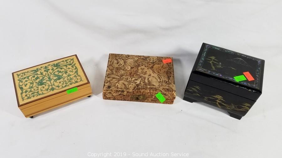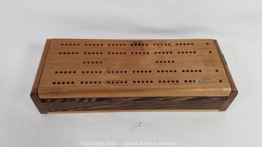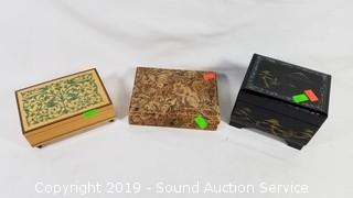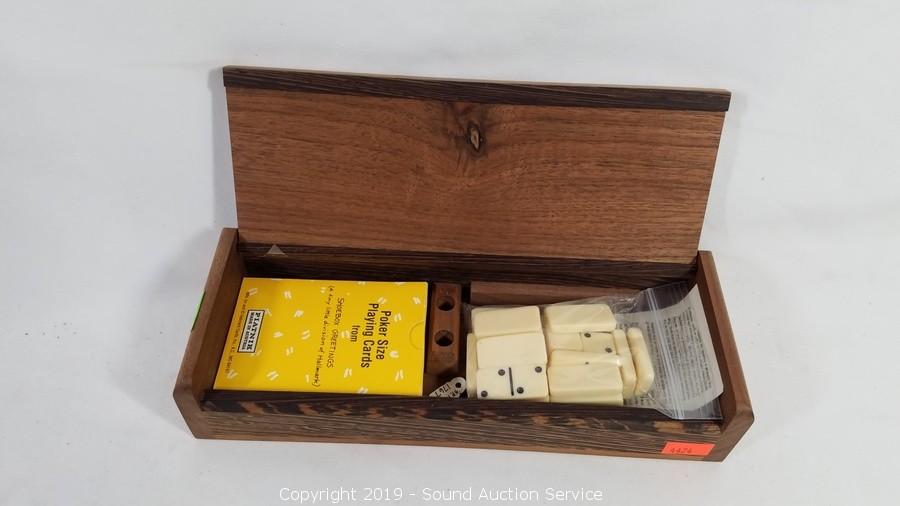 Item Description: Asian MOP inlaid music box, beautiful inlaid trinket boxes, and wooden cribbage board game box with dominos, poker cards, and cribbage pieces. Largest is approx. 3" x 5" x 10.5".