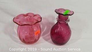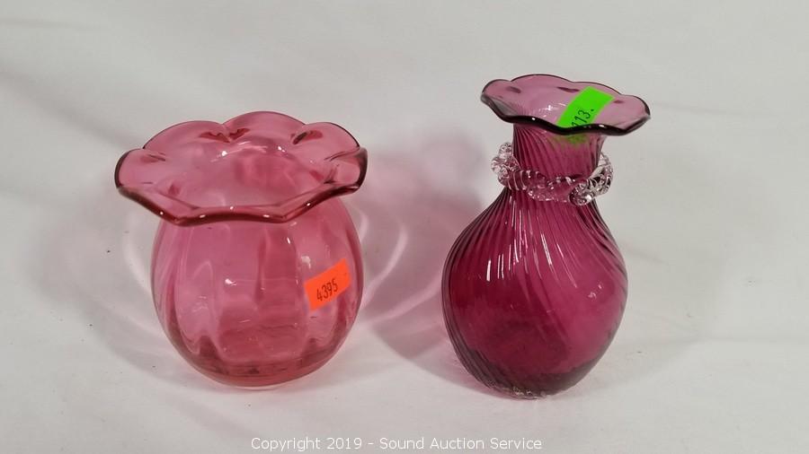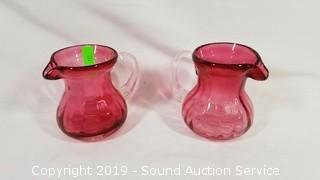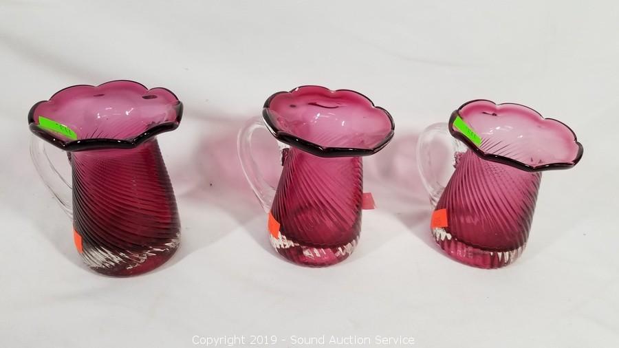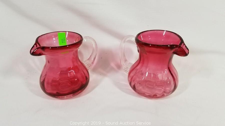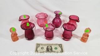 Lot #0113: 9pc. Pink Art Glass Cups, Pitcher, Vase & Figures