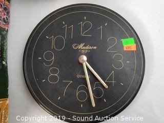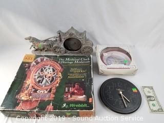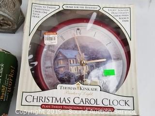 Item Description: The build your own clock looks to be complete, has some mold present. Others include: aluminum carriage mantle clock frame, Thomas Kinkade (plays traditional Christmas carols), and Madison quartz clocks.