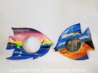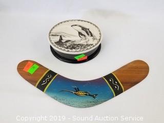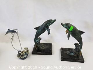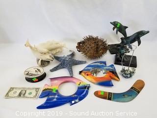 Item Description: Scrimshaw orca trinket box, genuine 6" dried puffer fish, brass dolphin sculptures, starfish, fish mirrors (one is missing the mirror), boomerang, Cook Company whale sculpture, and composite dolphin sculpture.