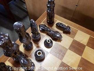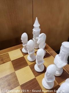 Item Description: Missing 2 white and 3 black pieces (2 of the blacks are broken, comes with pieces). Table is approx. 21.5" x 23" square. Pieces are approx. 4.5" to 6" H.