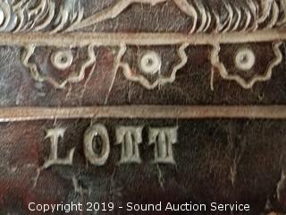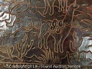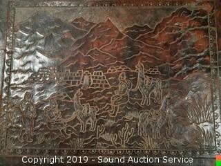 Item Description:  Leather top is signed "Lott". Image of a  Spanish desert. Approx. 23.5" H, 22" x 16".