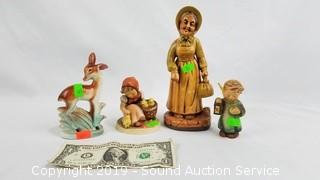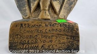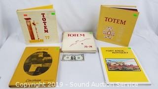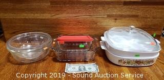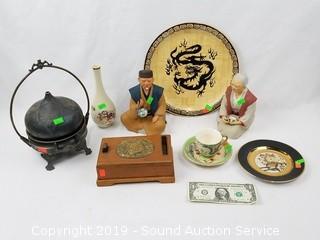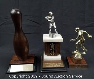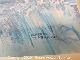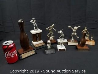 Item Description: Pair of Original A/S Landscape Artwork (Oil on canvas "T. Williams" 23" x 19", and "Wistner"? 8" x 9"), Corning & Pyrex Cookware (Vegetable print Corning. (2) corning 10" x 10" x 2" casseroles, one with lid. 8" x 8" Pyrex, 6-cup Pyrex with lid, 8" mixing bowl & 8" x 3" casserole), 3pc 1976 Sherm Pehrson Landscape Prints, 9 Bowling, Baseball & Football Trophies, Metal Halogen Floor Lamp, Rembourrage Ultima AB Workout Machine, 2 Silk Faux Floral Arrangement Potted Plants, The Thinker & Buffalo Soldier Sculptures, Smith Corona DeVille 410 Elec. Typewriter, 6 German Outstanding Woman BWC 1986 Coffee Mugs, Asian China, Incense Burner & Hakata Figures, 2 Hummel's, Hand Painted Deer & Women Figures (TMK-3 57/0 Girl with Chicks, TMK-2 1959 Good Night Angel Hummel (has a chip on one wing). 3-1/2' to 8" tall), JFK Ceramic Coin Bank Bust, (4) 1970's Year Books & Fort Knox Basic Camp Book.