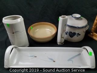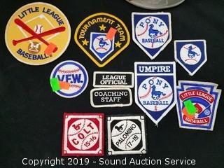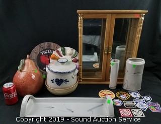 Item Description: Shelf is mirrored, can be hung, approx. 20" x 16" x 4". Includes: clocks, pear canister, tray, display case, little league tags, and more.