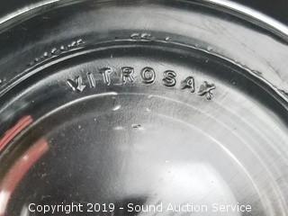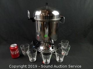 Item Description: Coffee pot is model 155C, stainless, complete, works, 17" H, 9" diameter. Comes with 6 Vitrosax Italian glass mugs.