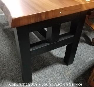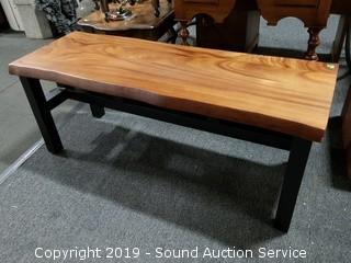 Item Description: Solid Acacia Wood, One-of-a-Kind, Manufactured Live Edge, 1.5" Thick Solid Acacia Wood Top with Lacquer Finish, Black Stained Solid Acacia Wood Base. 18" H x 46" L x 17" D.
