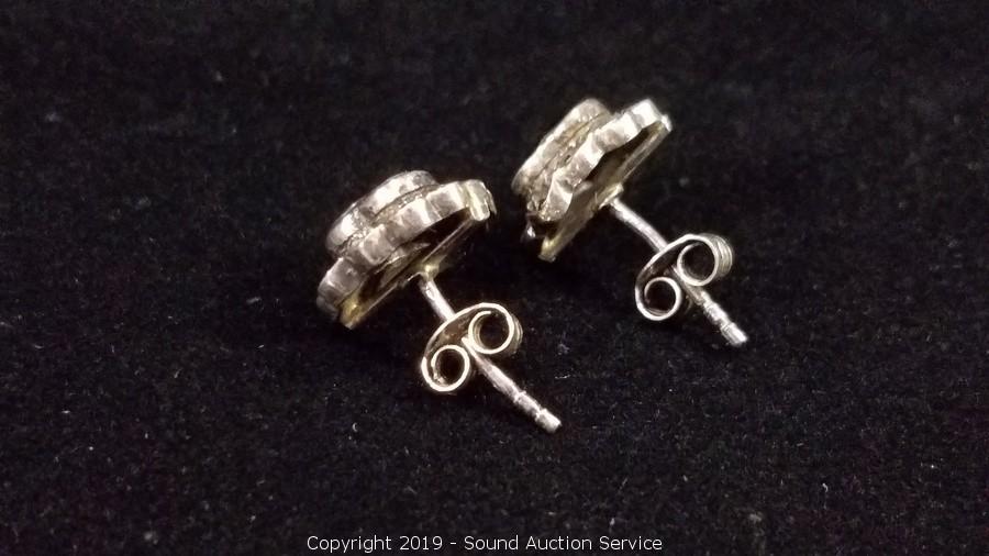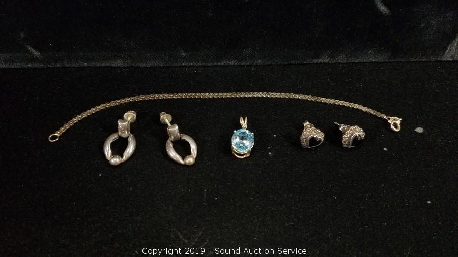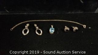 Item Description: TW: 11.9 grams. Includes: 6-3/4" sterling bracelet, sterling and marcasite earrings, sterling hoop earrings, and sterling and stone pendant with small diamond. ATTN: We are not jewelry experts or appraisers, please use your own judgement when bidding.
