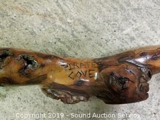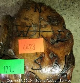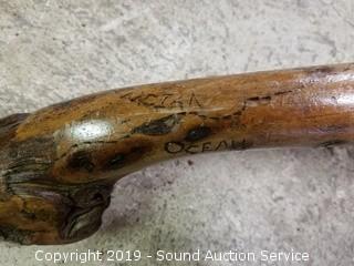Item Description: Has a carved contoured hand grip, carved compass NESW into the handle, and locations along the shaft.