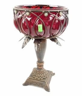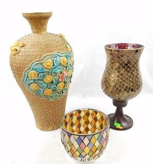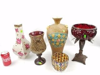 Item Description: Includes a Burleigh Ware, England vase, high relief vase, party lite compote/candle holder, ruby glass compote and other. Largest is 15" tall.