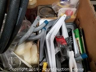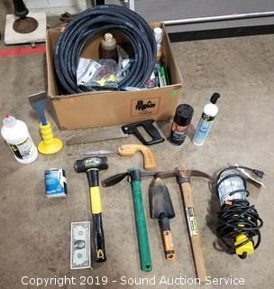 Item Description: Mallet, 3/8" x 50'ft? 300PSI Air Hose, Drop Light, Hand Saw, Gardening Tools, Chalk, Shelf Brackets, Wire Brush & More.
