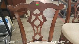 Item Description: Vase splat back with cabriole legs, fabric upholstered seat. 30" to seat, 47" H x 19" diameter.