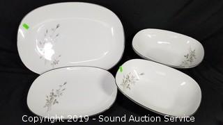 Item Description: Includes (12) 10.5" dinner plates, (12) 8.25" salad plates, (12) 6.25" snack plates, 12 tea cups, 12 saucers, cream, sugar, tea pot, gravy boat, 12" oval serving dish, (2) 10" oval serving bowls, 10" and 15" platters. All appear to be in excellent condition. Do not notice any damage.