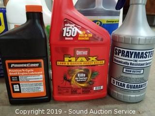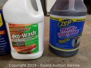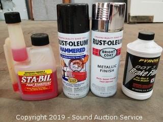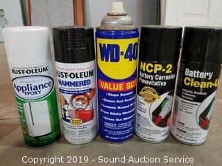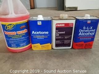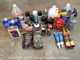 Item Description: All are at least half full to mostly full. Includes Lind Seed Oil, Acetone, Deck & Patio wash, House wash, Multi Purpose Cleaner/Degreaser, Self Leveling Sealant, Concrete Patch, Battery Cleaner, Rustoleum paint, WD-40 and more.