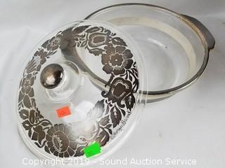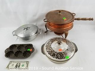 Item Description:  Also comes with a cast iron muffin pan. 2qt  Anchor Hawking Fire King with Briar silver  overlay, casserole dish and Everlast forged  aluminum casserole dish with Pyrex insert and  copper chafing dish.