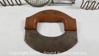 Tons of great items, rare, unique, old, bold! Includes: Blacksmiths Leg Box Vise, Rattan Patio Bar, Tiki Torches, Huge Ceramic Panther Sculpture, Collectible Coins, Vtg. Kitchen Gadgets, Vtg. Tools (Levels, Planes, Braces, Molding Planes), Some Nice Wicker Baskets, Beautiful Oak Dining Table, Blowers, Trimmers, Cordless Drills, Noritake Old Country Roses Fine China, Collectors Books, Miniature Cameras, Vtg. Doll / Child's Furniture, Vtg. Metal Bakers Cabinet & Much More!