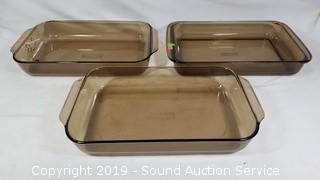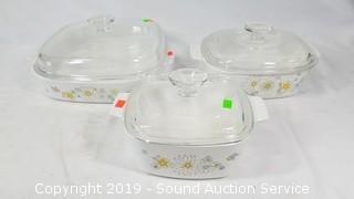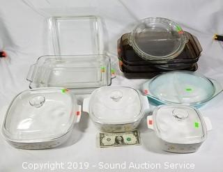 Item Description: Clear Pyrex casserole, pie pans, Pyrex brown casseroles (looks like Visions), Pyrex 1.5qt snowflake print covered casserole, 3 Corning "Daisy Floral Bouquet" casseroles (1.5QT, 2QT and 2-1/2" x 10.5" x 10"),